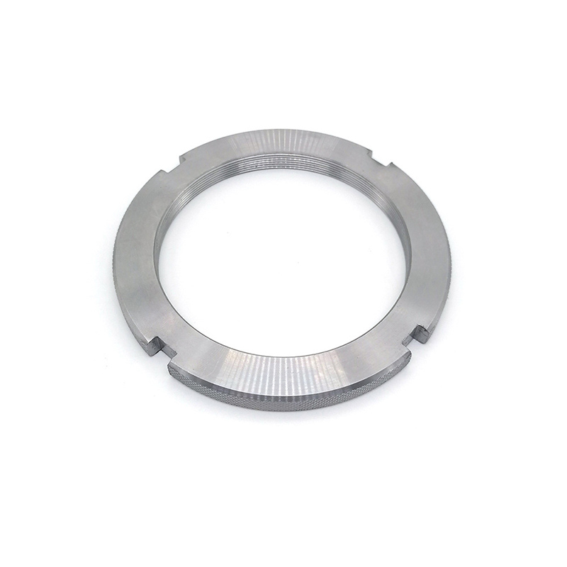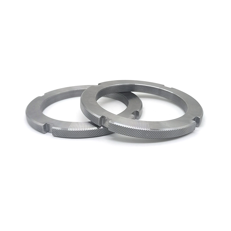 पूर्ण रूपमा थ्रेडेड स्लटेड राउन्ड नटहरू - तिनीहरू DIN 546 जस्ता मापदण्डहरू अनुसार परिभाषित हुन्छन् र मुख्य रूपमा सुरक्षित बन्धन जडान प्राप्त गर्न प्रयोग गरिन्छ र कम्पनहरू सामना गर्न सकिन्छ। यी नटहरूको मुख्य विशेषता नटको एक छेउमा काटिएको स्लटहरूमा निहित छ। तिनीहरूलाई कसरी प्रयोग गर्ने भनेर यहाँ छ: पहिले, नटलाई प्रि-ड्रिल गरिएको बोल्ट वा स्टडमा पेंच गर्नुहोस् र यसलाई इच्छित स्थानमा कस्नुहोस्। कडा गरेपछि, बोल्ट शाफ्टको प्वालसँग स्लटलाई पङ्क्तिबद्ध गर्नुहोस्। अन्तमा, पङ्क्तिबद्ध स्लट र बोल्ट प्वाल मार्फत खुला पिन (लकिङ वाशर) वा सुरक्षा रेखा घुसाउनुहोस्, र त्यसपछि सुरक्षित फिट सुनिश्चित गर्न पिनको छेउलाई झुकाउनुहोस्। यसरी, कम्पनको उपस्थितिमा, नट ढीलो हुनेछैन।