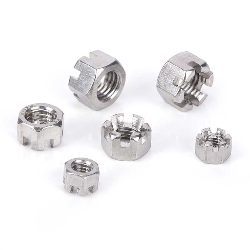 यी 1/2"-20 वा 5/8"-18 जस्तै आंशिक इन्च आकारहरूमा पनि आउँछन्। हेक्स साइजले मानक SAE रेन्च साइजहरू पछ्याउँछ, र स्लट स्पेसिङ कोटर पिन व्यासहरू मिलाउन निश्चित गरिएको छ, सामान्यतया 1.5mm देखि 3mm नट साइजमा निर्भर गर्दछ।